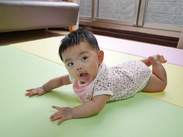 原本我們都是讓她在床上玩,但發現床偏軟,翻身並不好施力