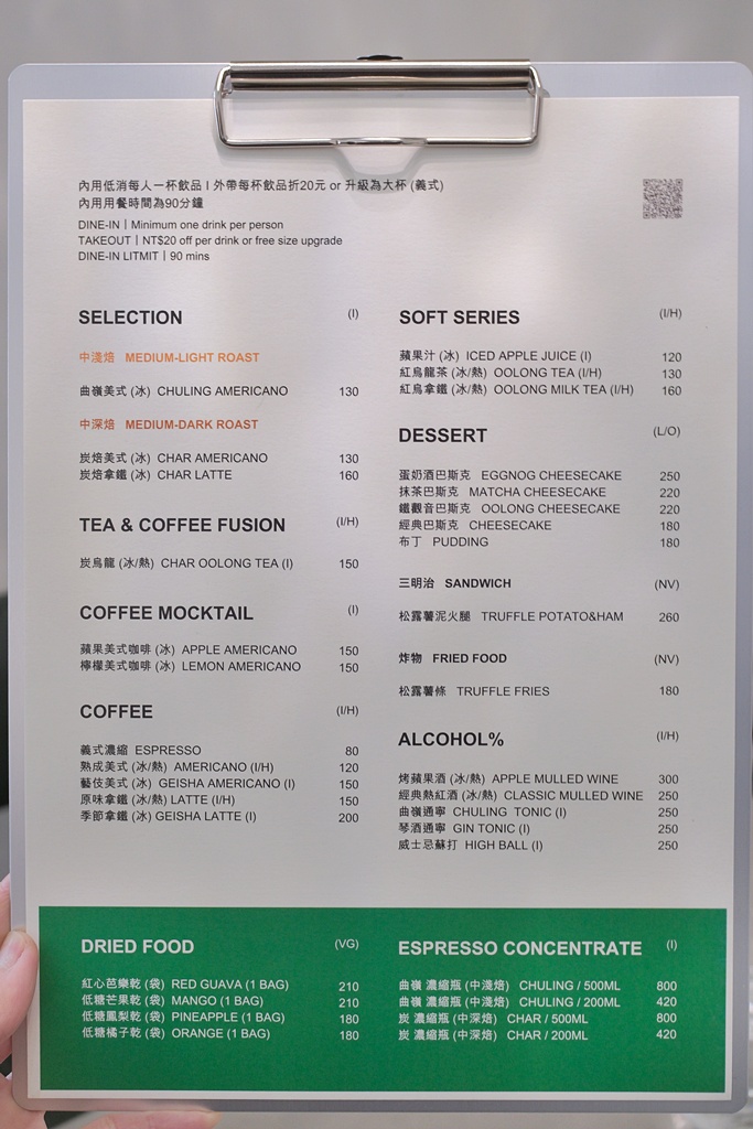 提供各式咖啡飲品,餐點部分原本只有甜點,在11月份新增了三明治和炸物,另外還有酒類飲品!
