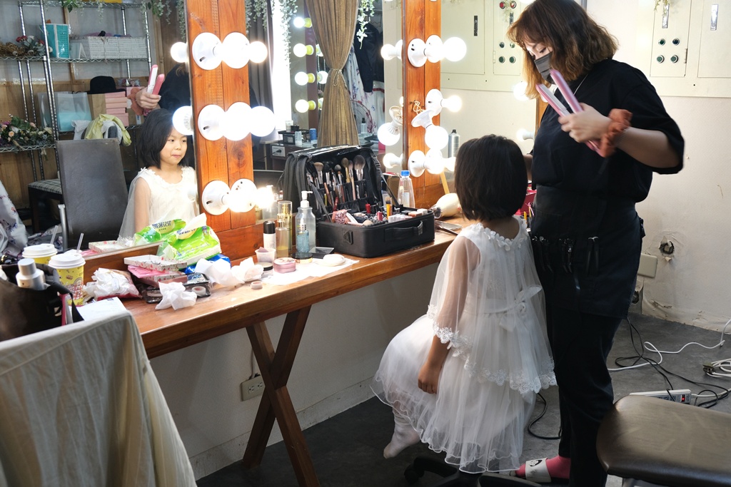 我們是一大早就到新竹伊頓配合的鵲爾喜攝影棚拍攝,只要是伊頓的客人都可以免費使用,無需額外自己租攝影棚!而且地點也很方便,在新竹伊頓的樓下就是了~一般女生做造型及妝髮都需要大約2小時,所以一早8點時,我就先到伊頓梳妝,讓饅頭和仙貝多睡一下,這樣之後才有活力拍照。