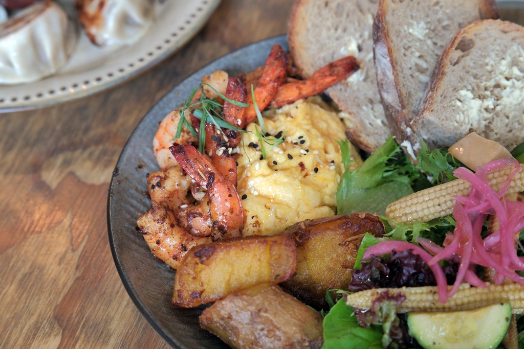 主角是店家自製的香料炒鮮蝦,香氣十足且口感彈牙,一旁是滑嫩的炒蛋、烤地瓜、沙拉和自家製酸種麵包,特別喜歡地瓜,外皮帶點微脆,內心很軟綿,麵包也不錯,但建議要趕快吃,冷掉會變很硬唷~