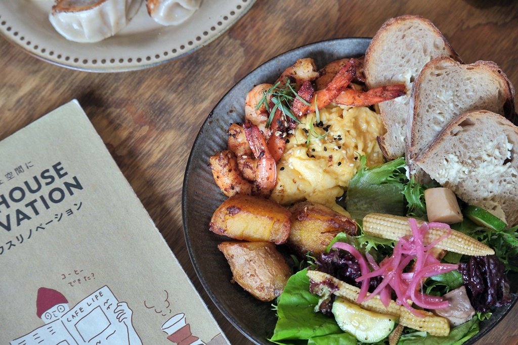 主角是店家自製的香料炒鮮蝦,香氣十足且口感彈牙,一旁是滑嫩的炒蛋、烤地瓜、沙拉和自家製酸種麵包,特別喜歡地瓜,外皮帶點微脆,內心很軟綿,麵包也不錯,但建議要趕快吃,冷掉會變很硬唷~