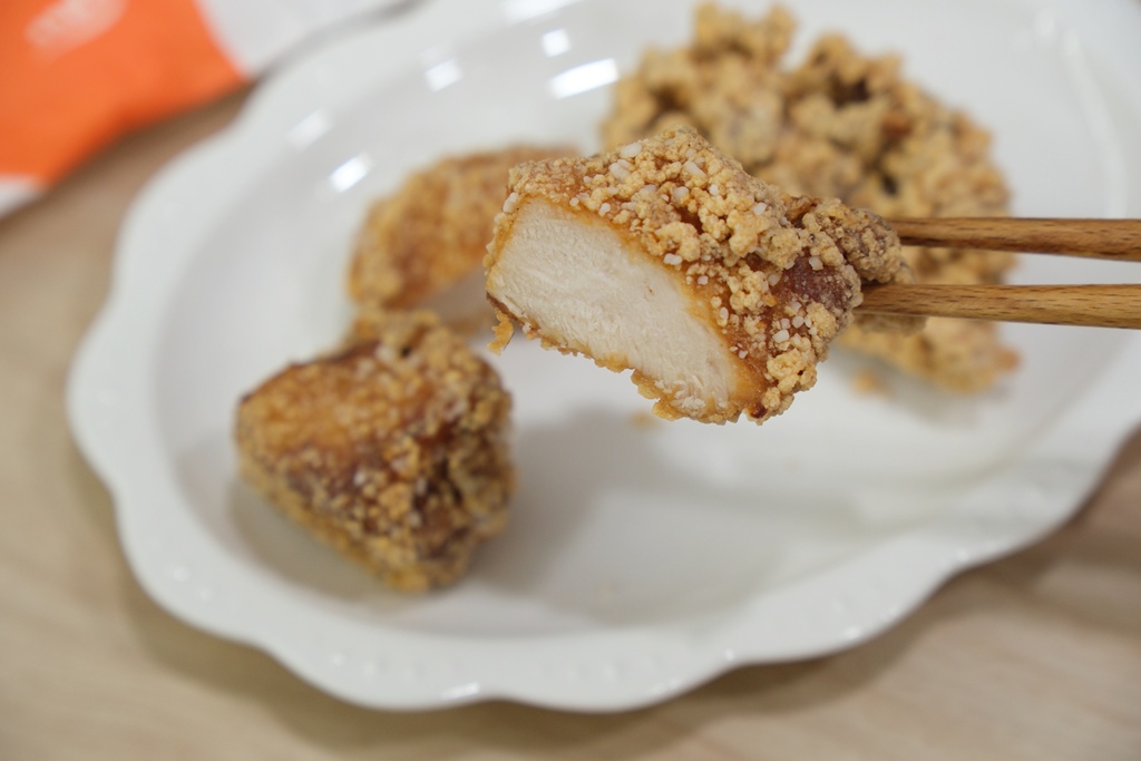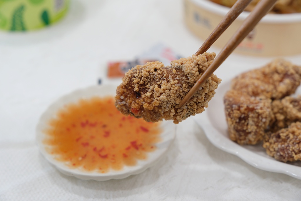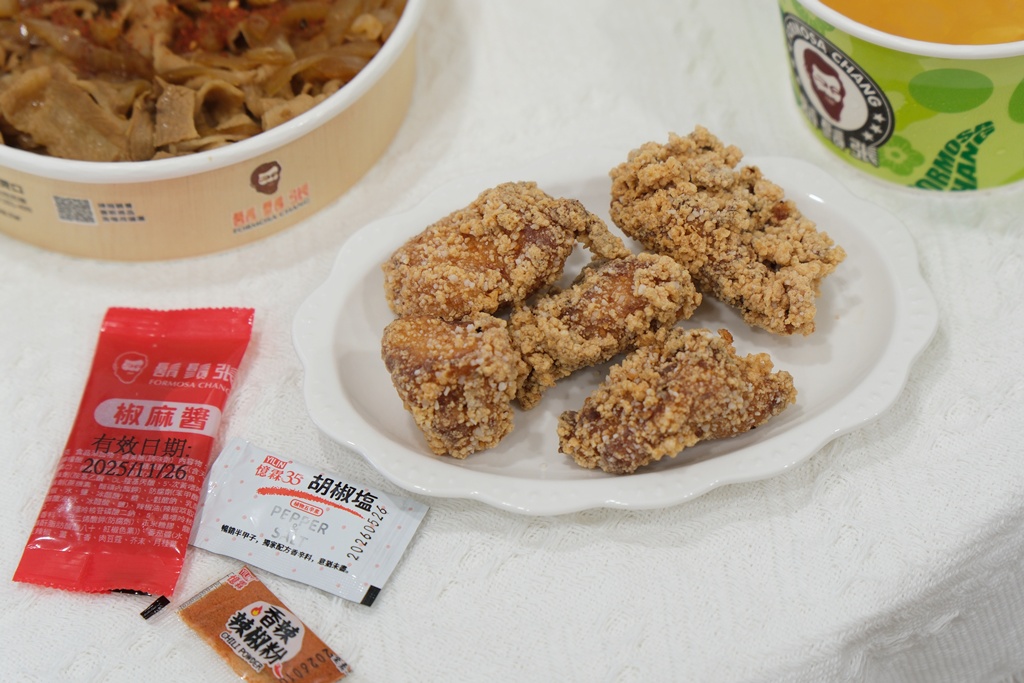 只要買便當就可用優惠價加購,我第一次吃鬍鬚張的炸雞,蠻喜歡它的外皮口感、十分酥香,肉質也是保有肉汁的那種,可搭配椒麻醬、胡椒鹽或辣椒粉,沾點椒麻醬秒變泰式椒麻雞,搭配丼飯一起吃超過癮!