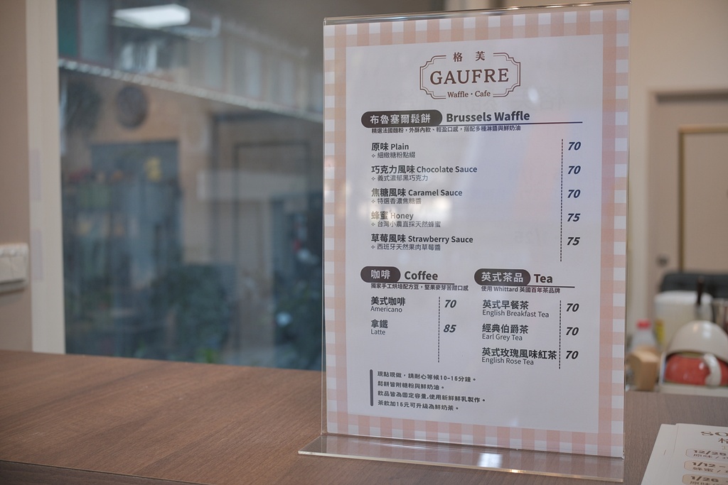 主打布魯塞爾鬆餅,有五種不同風味的淋醬可選擇,皆附糖粉與鮮奶油!飲品部分有咖啡和英式茶品。
