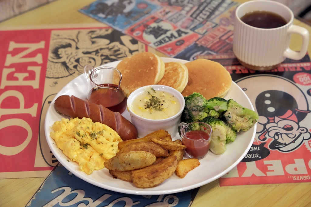 拼盤包含現煎鬆餅、墨西哥香料薯條、青花菜沙拉、豬肉香腸、炒蛋和玉米濃湯,沒有華麗的擺盤、過多的點綴,就是一樣樣擺上用心手作的食材,除了薯條邊邊有點硬,其他表現都蠻不錯的,還有附一杯香醇順口的熱紅茶,整體吃完很舒服、毫無負擔~