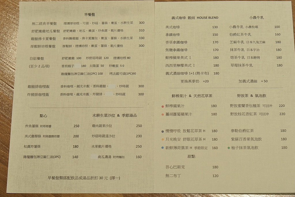 早餐盤的選擇有四種,也可以自組餐盤(至少兩個品項),還有咖哩飯、點心等餐點;飲品部分有義式咖啡、小農牛乳系列、鮮榨果汁和花草茶等,早餐盤類搭配飲品或湯品可折30元。