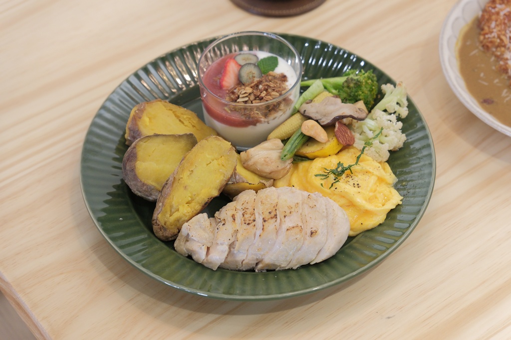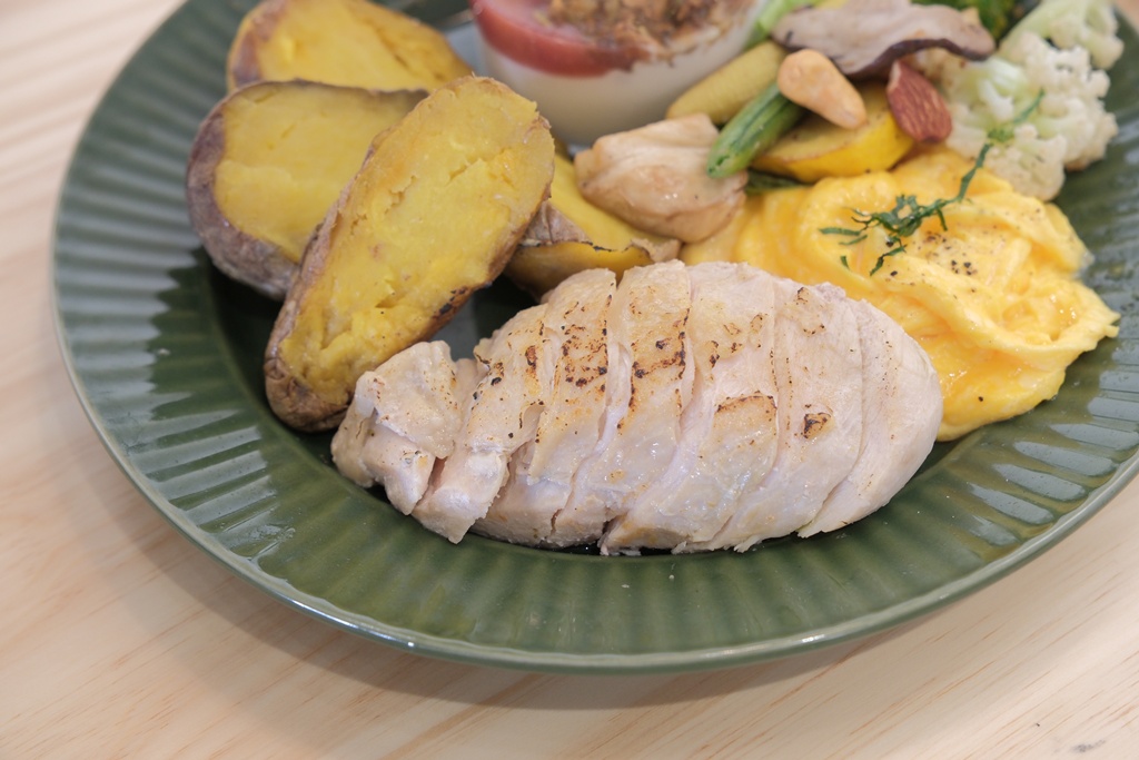 一端上桌有點驚艷,這款早餐盤內容有舒肥嫩雞、嫩蛋、炒時蔬、地瓜和脆片優格,內容比我預想的更豐盛,份量蠻多的~有點可惜雞肉邊角偏乾,要吃到至中間部分口感才會比較水嫩,帶有迷迭香之類的香料味(目前還是最喜歡熒熒商行的雞胸),我當下有給老闆建議,期待之後會調整得更好~炒時蔬調味清爽,搭配地瓜和優格,滿滿的原型食物,完全就是我平常超愛的料理!